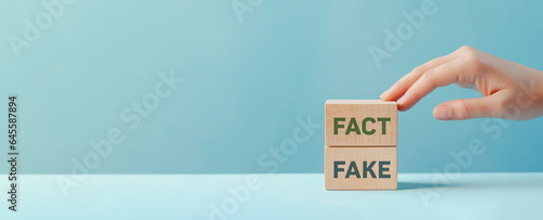 Fact or Fake concept, Hand choose fact wood cube on pastel blue background, April fools day