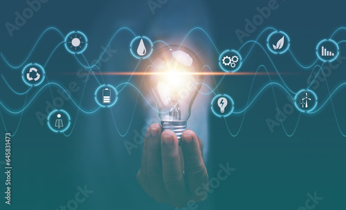 Creative ideas of saving energy and renewable power concept, New ideas for energy management, Hand holding glowing lightbulb with sine wave and energy icon, Saving investment, Inspiration.
