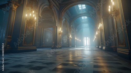Vue en perspective d'un couloir d'un palais vide, généré par IA