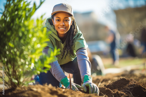 Young black female landscaper doing her job. Young woman gardener working in greenhouse.