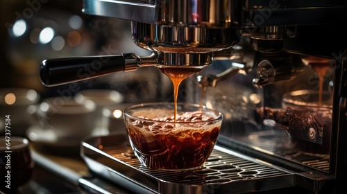 Cafe Barista hand making coffee with ground coffee manually using tamper with coffee machine in cafe bar