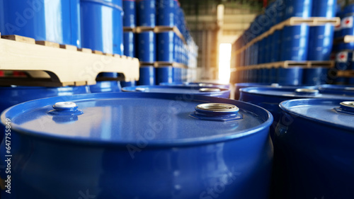 Chemical storage tanks neatly stored on wooden pallets in Warehouse. Warehouse management and industrial chemistry concept.