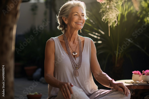 Happy senior woman meditating and exercising yoga, Cheerful woman following a holistic lifestyle at home