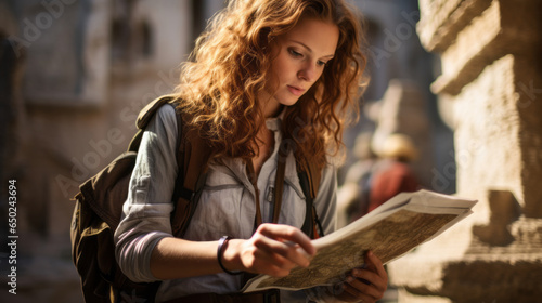 Young archeologist woman taking part in a high-stakes competitive treasure hunt in an ancient archaeological site looking at documents and map to find the relics
