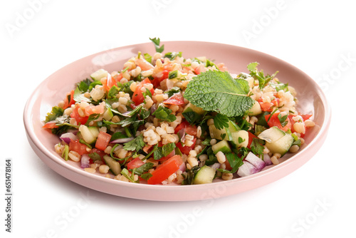 Plate with delicious tabbouleh salad on white background