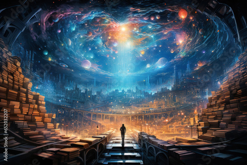 A young man running inside a giant library with futuristic architecture and a glass dome Generative AI Illustration