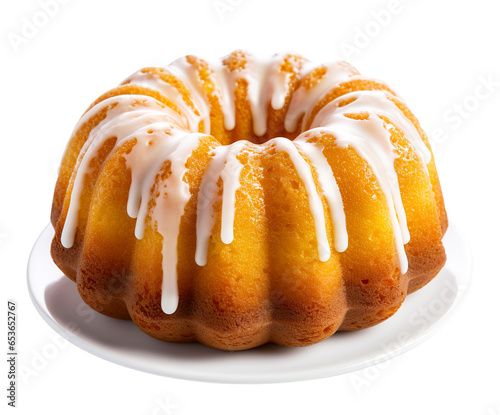 Vanilla bundt cake drizzled with powder sugar glaze on white plate. Isolated cutout on transparent or white background.