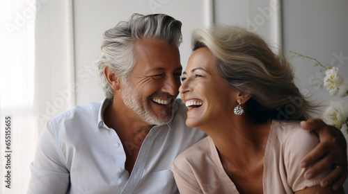 Beautiful gorgeous 50s mid age elderly senior model couple with grey hair laughing and smiling. Mature old man and woman close up portrait. Healthy face skin care beauty, skincare cosmetics, dental