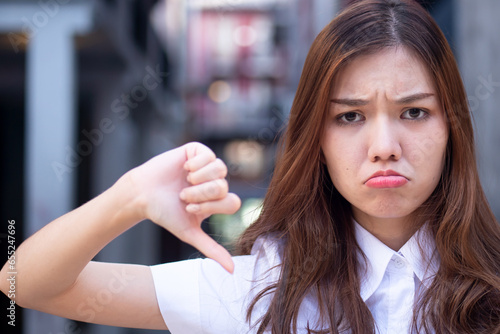 Upset Chinese asian woman office worker pointing rejecting thumb down hand gesture
