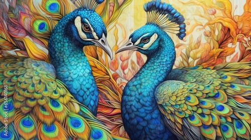 Striking peacocks displaying their feathers. Fantasy concept , Illustration painting.