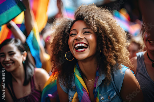 Group of friends celebrate gay pride with flags by dancing at a demonstration for support for equality