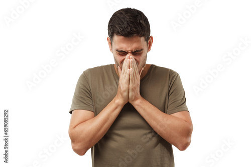 Sick young man covering face with hands, sneezing