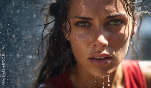 #1339285403Woman with freckles smiles blissfully under cascading water, her face radiating joy and tranquility, capturing a refreshing and serene moment.