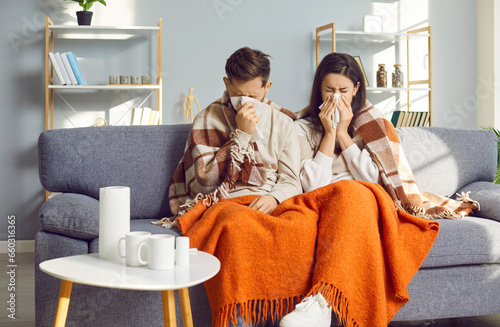 Young couple covered in blankets sitting on sofa at home with seasonal flu or cold. Sick unhappy man with woman sneezing into a tissue suffering from runny nose and feeling unhealthy with influenza.