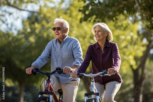 #181535824Happy senior couple ride bicycles together in a sunlit park during autumn. They smile and laugh while cycling on bikes, enjoying active retirement outdoors. This scene shows love and togetherness.