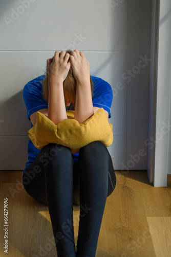 Zrozpaczona kobieta siedzi na podłodze w sypialni za zamkniętymi drzwiami