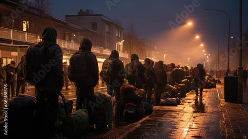 Modern world problem refugees, displaced immigrants emigrants, war victim fleeing military conflict, saving your own life, homelessness waifless children, group of people with luggage.