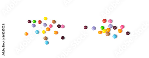 Scattered small candies isolated. Colorful dragees, multicolored glazed chocolate buttons