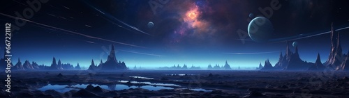 fondo panorámico para doble pantalla o banner de un paisaje extraterrestre futurista en una noche de ciencia ficción y aventura