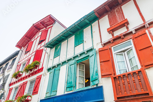 Typical colored facades of Basque country buildings in the center of Saint-Jean-de-Luz, France
