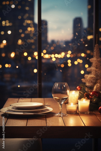 Table setting for Christmas dinner in restaurant with window view and city lights.