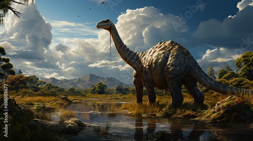 #621265016Image of dinosaur similar to Apatosaurus on the background of prehistoric landscape with trees.