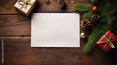#670157129Flat lay, blank paper sheet and christmas decor on wooden table, space for text, 16:9