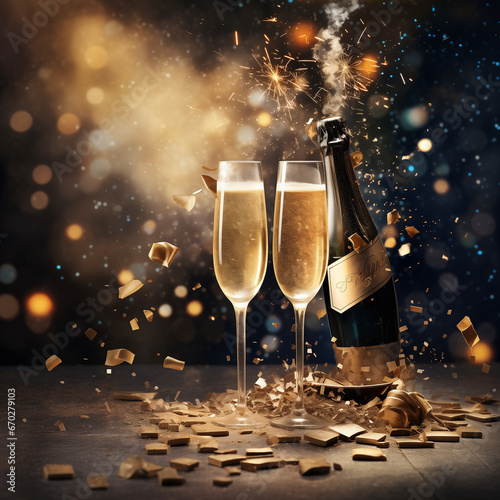 Karta na Nowy Rok, rocznicę. Toast, szampan, kieliszki, ai generative