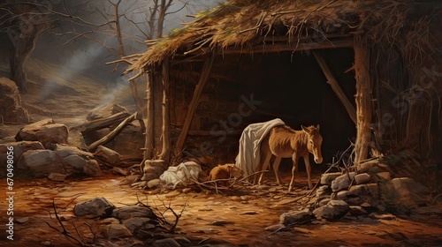 The sacred birthplace of Jesus, a humble stable with a manger as His first cradle. Nativity, divine infant, holy manger, humble beginnings. Generated by AI.