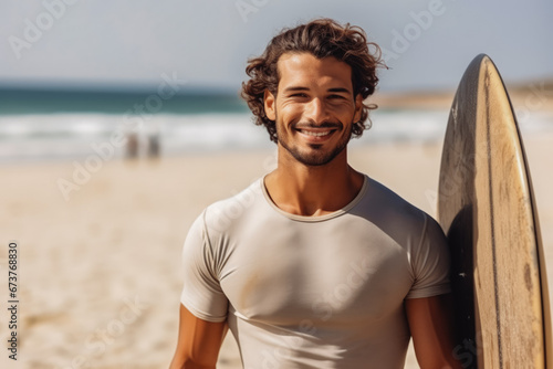 Arab male surfer on the beach with surfboard in hand. Handsome male surfer smiling at camera, ready to go surfing. Summer at the beach, surfing