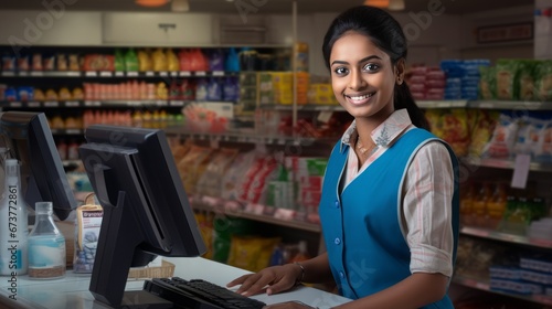 Smiling Indian Cashier at Supermarket Checkout Counter