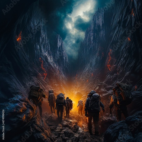 AI generated illustration of a group of people hiking up a mountainous trail at night