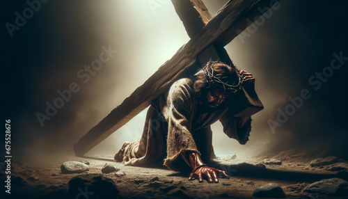 The Stations of the Cross: Jesus Christ's First Fall under the Weight of the Cross, A Moment of Suffering, Torment, and Crucifixion.