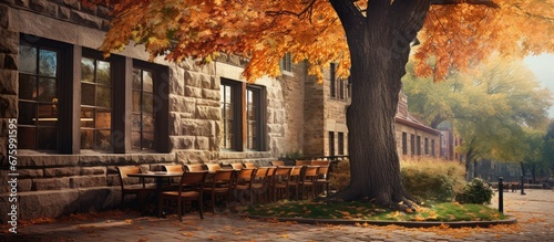 In the crisp autumn day the old tree with colorful leaves stood tall beside the grassy lawn while an elegant building with a stone wall showcased beautiful architecture Through the restaura