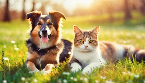Perro y gato tranquilos y amigables posando tranquilamente en un cesped de una tarde de verano
