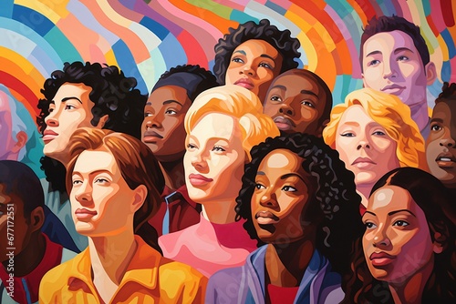 #677164361A diverse group of individuals attentively listening to a speaker at a vibrant and imaginative youth panel discussion. The background features colorful, swirling patterns, creating a lively