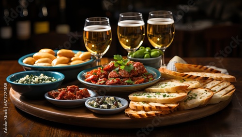Beer and Appetizers on Wooden Tray at Night Party