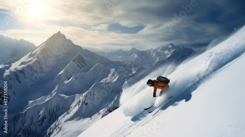 Adventure. Extreme sports. wide shot of skier going down snowy mountain at sunrise
