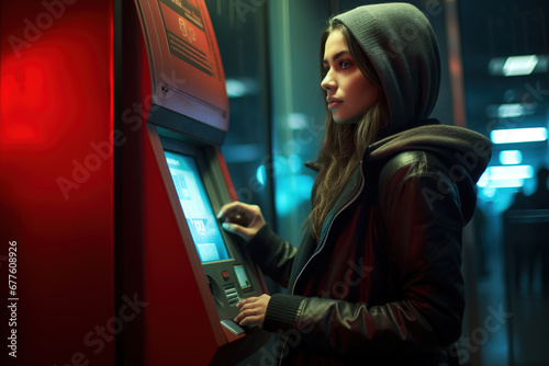 Young happy brunette woman withdrawing money from credit card at ATM at night.