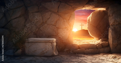 #1223823833A frosty cave with jagged icicles and rugged rock formations, illuminated by a warm golden glow, creating a serene winter atmosphere