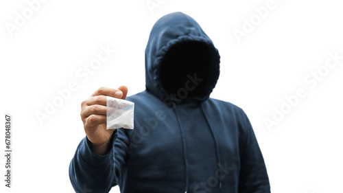 Faceless man in a hood holds transparent plastic bag with white powder hard drugs isolated on transparent background, anonymous drug dealer or gangster sells narcotics