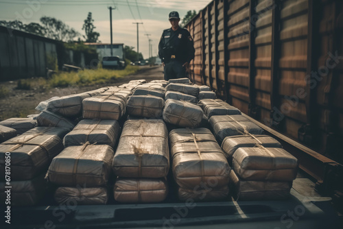 Drug trafficking Police stopped. Criminals transporting consignment of drugs. Police arest and seized a shipment of drugs, stopped drug courier, drug dealer, drug trafficker. Border custom control.