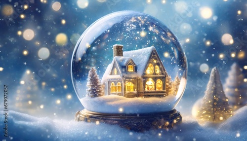 Szklana kula z domkiem w środku. prószący śnieg, światełka i dekoracje świąteczne. Świąteczny zimowy nastrój pełen ciepła światła, śniegu. Choinki pokryte śniegiem. Niebieskie tło, miejsce na tekst.