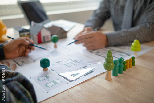 Construction engineers discuss and exchange ideas with architects to improve house plans to meet customer needs. A concept for exchange of design ideas between construction engineers and architects.