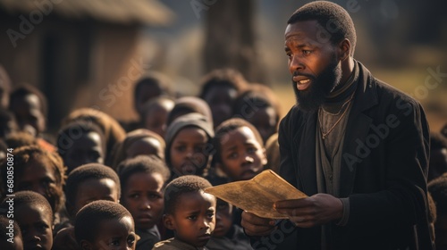 African pastor or priest preaching in village outside to group of poor looking children.