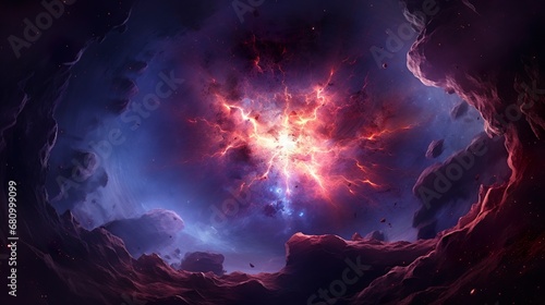 Cosmic nebula in space among stars and galaxies. Gas dust clouds nebula in outer space. Birth and expansion of universe. Formation of stars and planets from the nebula.