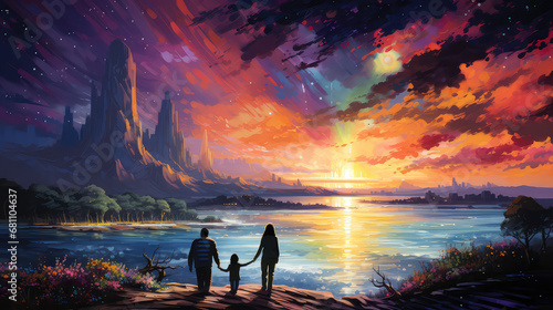 zakochana para na pomoście trzymająca się za rękę idących w śród zachodu słońca,