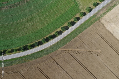 drohnenfoto landstrasse allee getreidefeld vogelperspektive