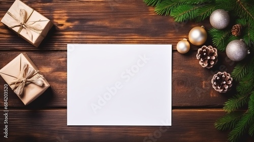 Flat lay, blank paper sheet and christmas decor on wooden table, space for text, 16:9