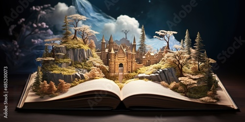 A magical book with pages that come to life, depicting fantasy landscapes and characters